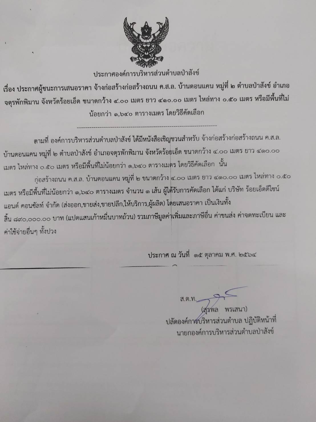 ประกาศผลผู้ชนะการเสนอราคา โครงการก่อสร้างถนน ค.ส.ล. บ้านดอนแคน หมู่ที่ ๒