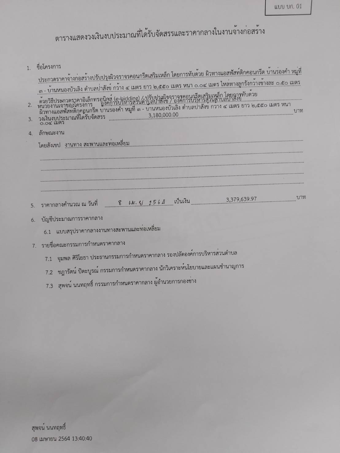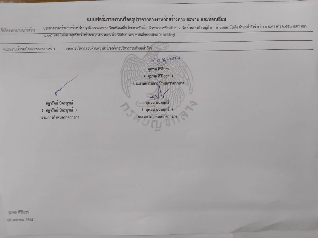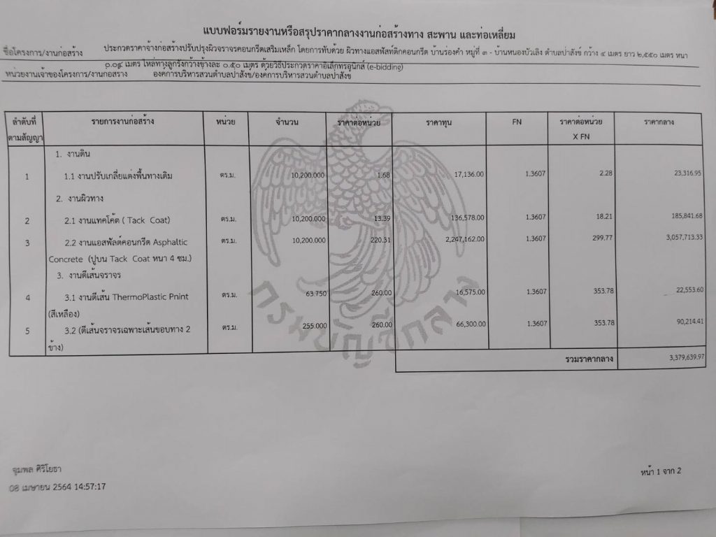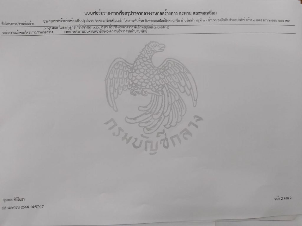 ราคากลางโครงการปรับปรุงผิวจราจรคอนกรีตเสริมเหล็ก โดยการทับด้วยผิวทางแอสฟัสท์ติดคอนกรีต บ้านร่องคำ หมู่ที่ 3 – บ้านหนองบัวเลิง