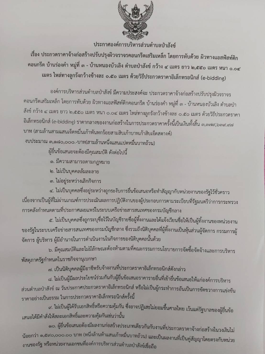ชื่อเรื่อง : ประกาศประกวดราคาจ้างก่อสร้างปรับปรุงผิวจราจรคอนกรีตเสริมเหล็ก โดยการทับด้วยผิวทางแอสฟัสท์ติกคอนกรีต บ้านร่องคำ หมู่ที่ 3 – บ้านหนองบัวเลิง ตำบลป่าสังข์